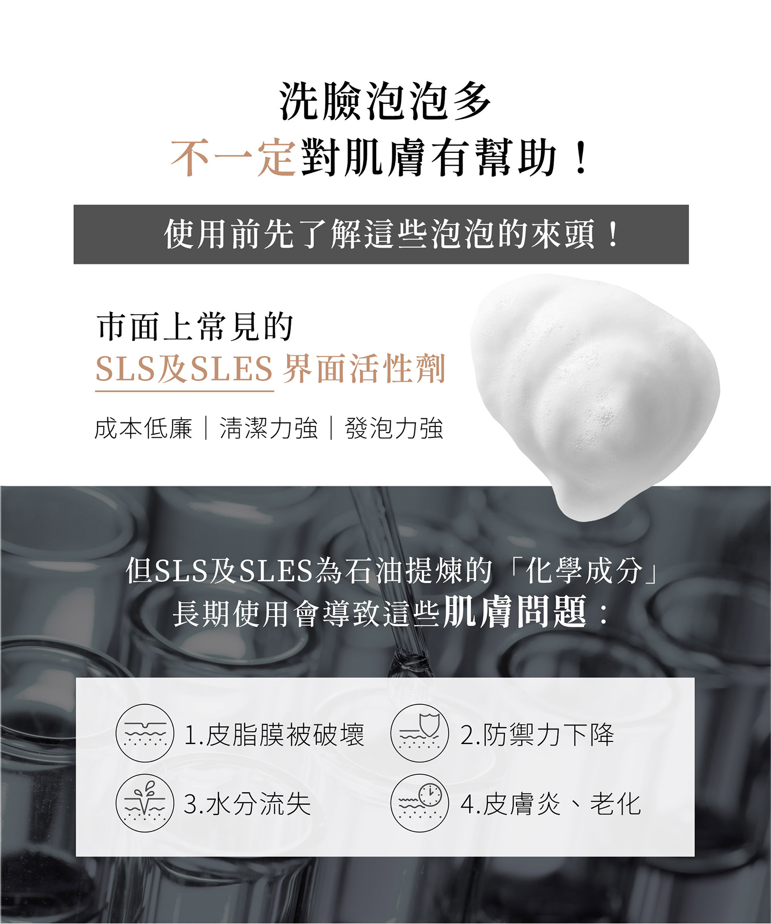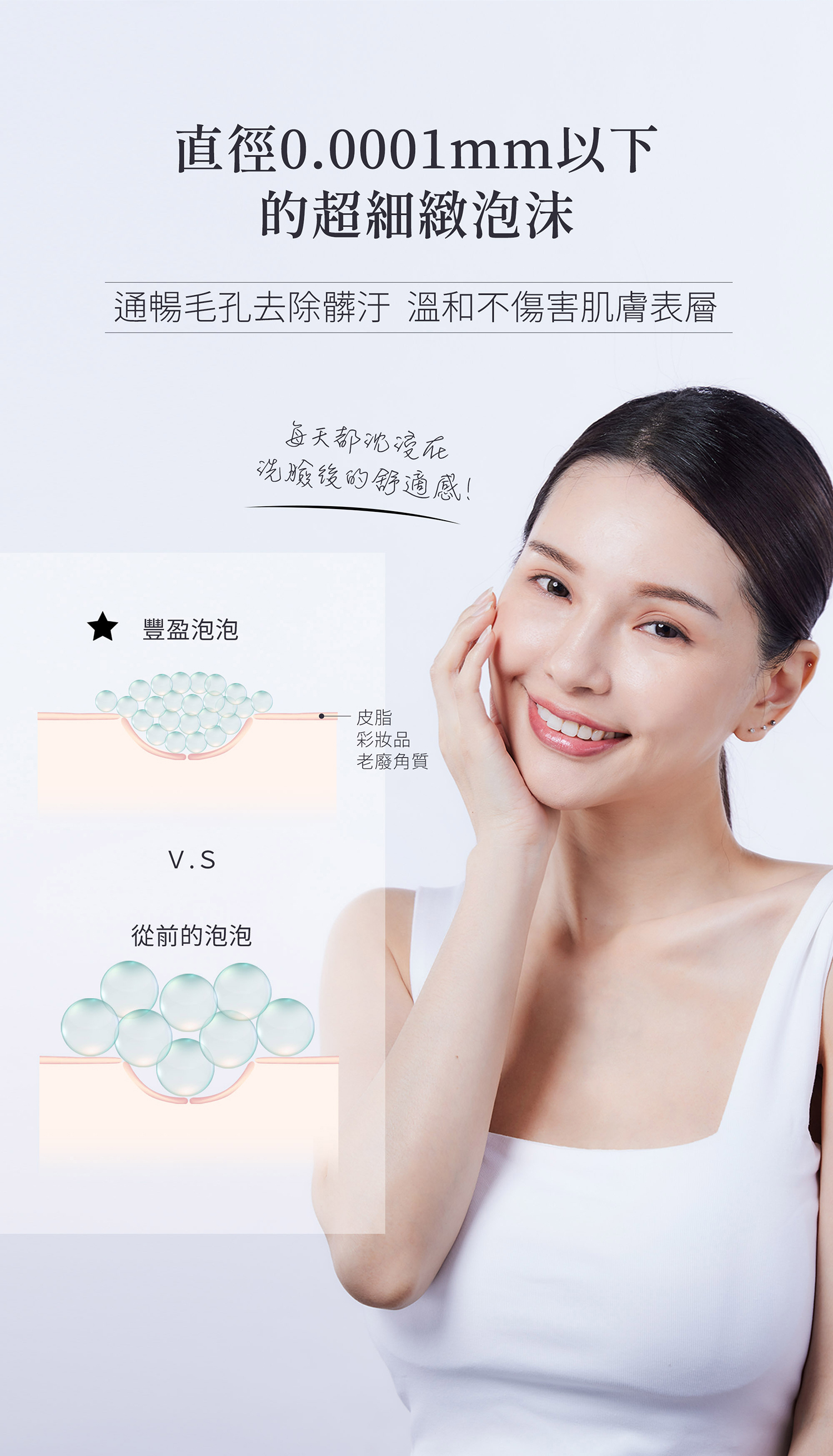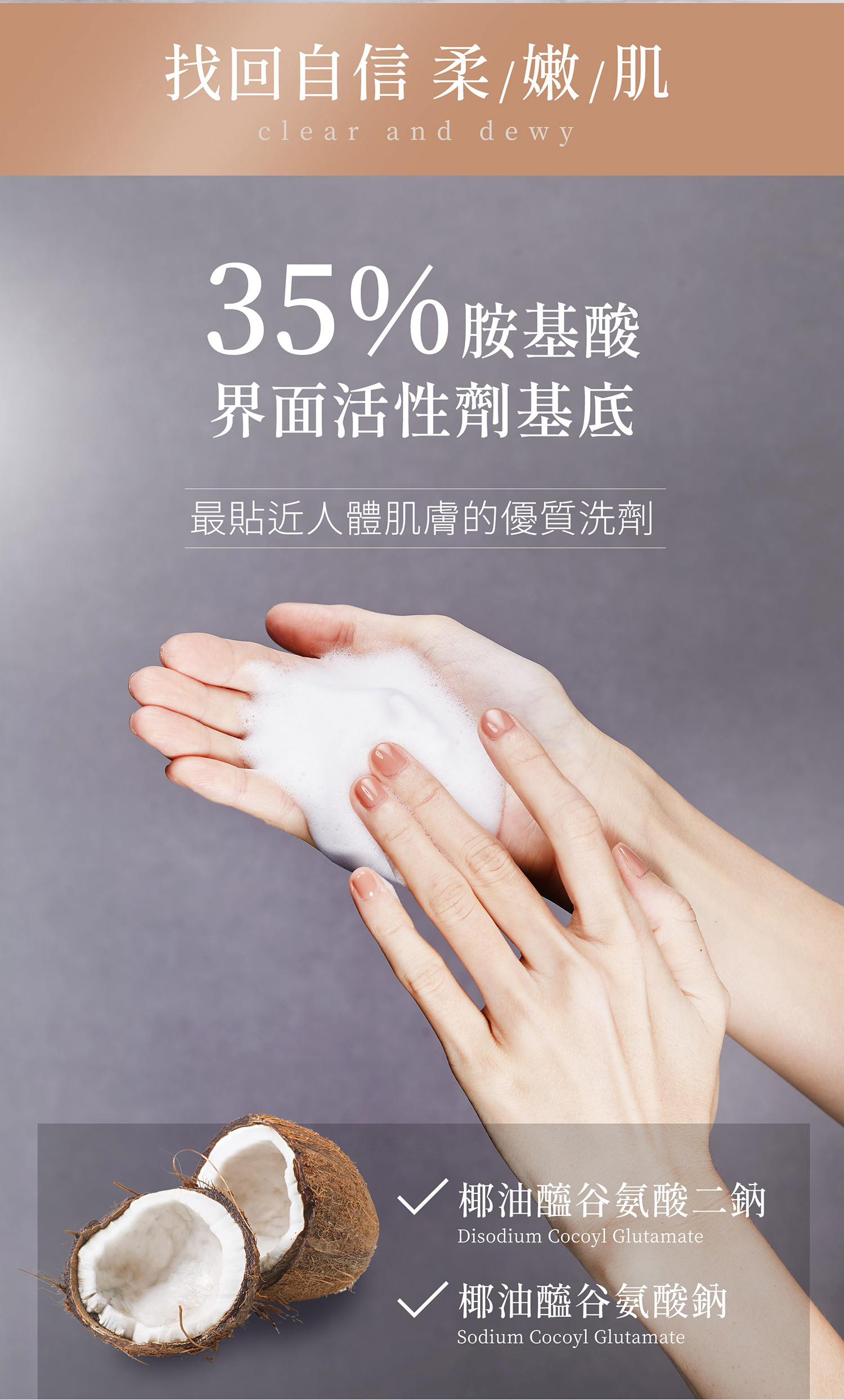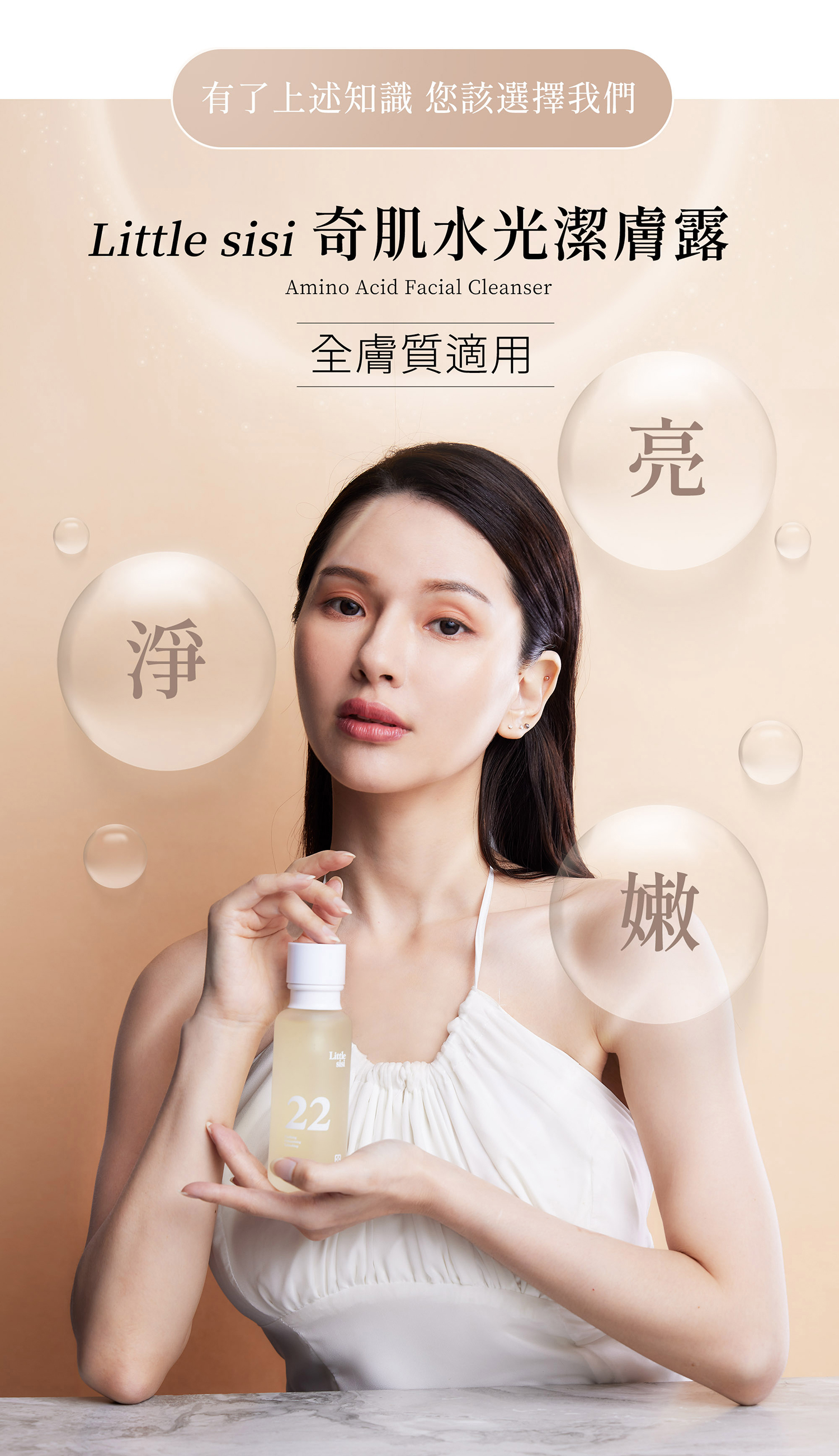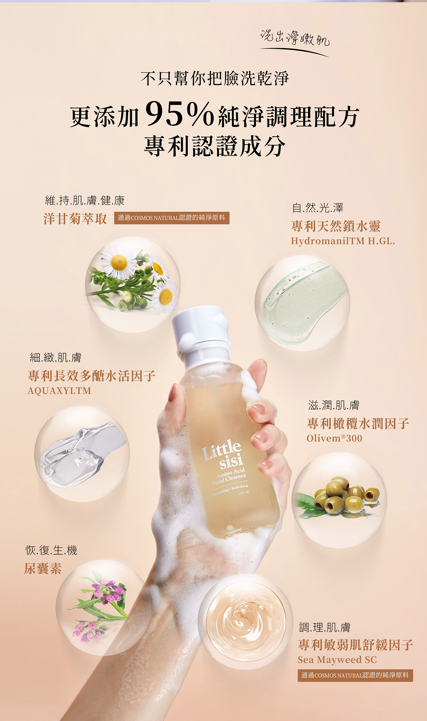 雙手洗淨後取適量奇蹟水光潔膚露於掌心,加水揉搓至完全起泡,以指腹輕輕按摩全臉30秒至1分鐘即可洗淨。