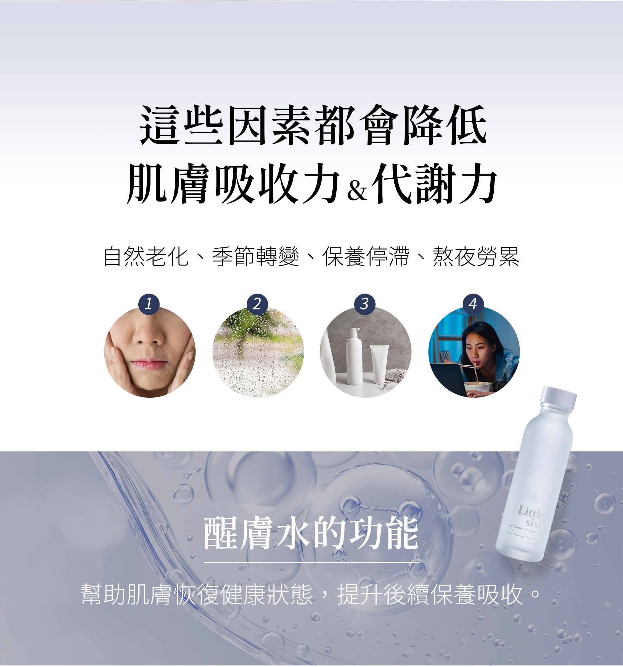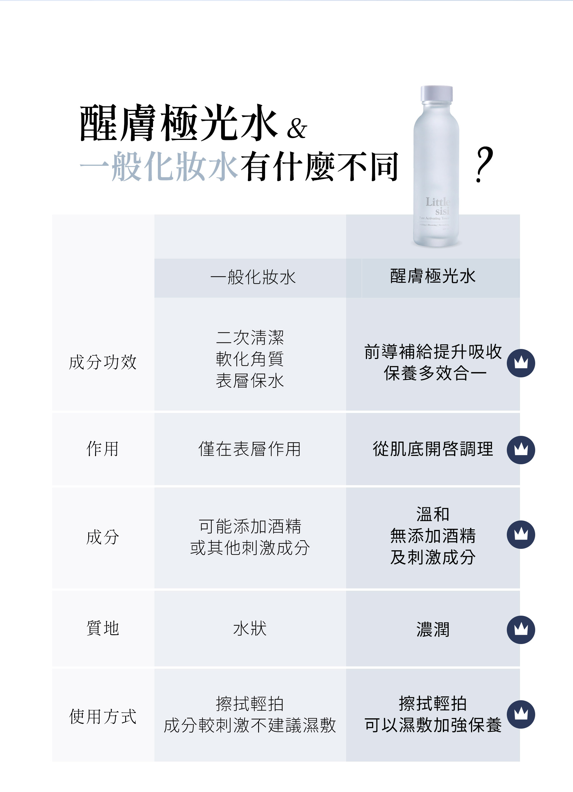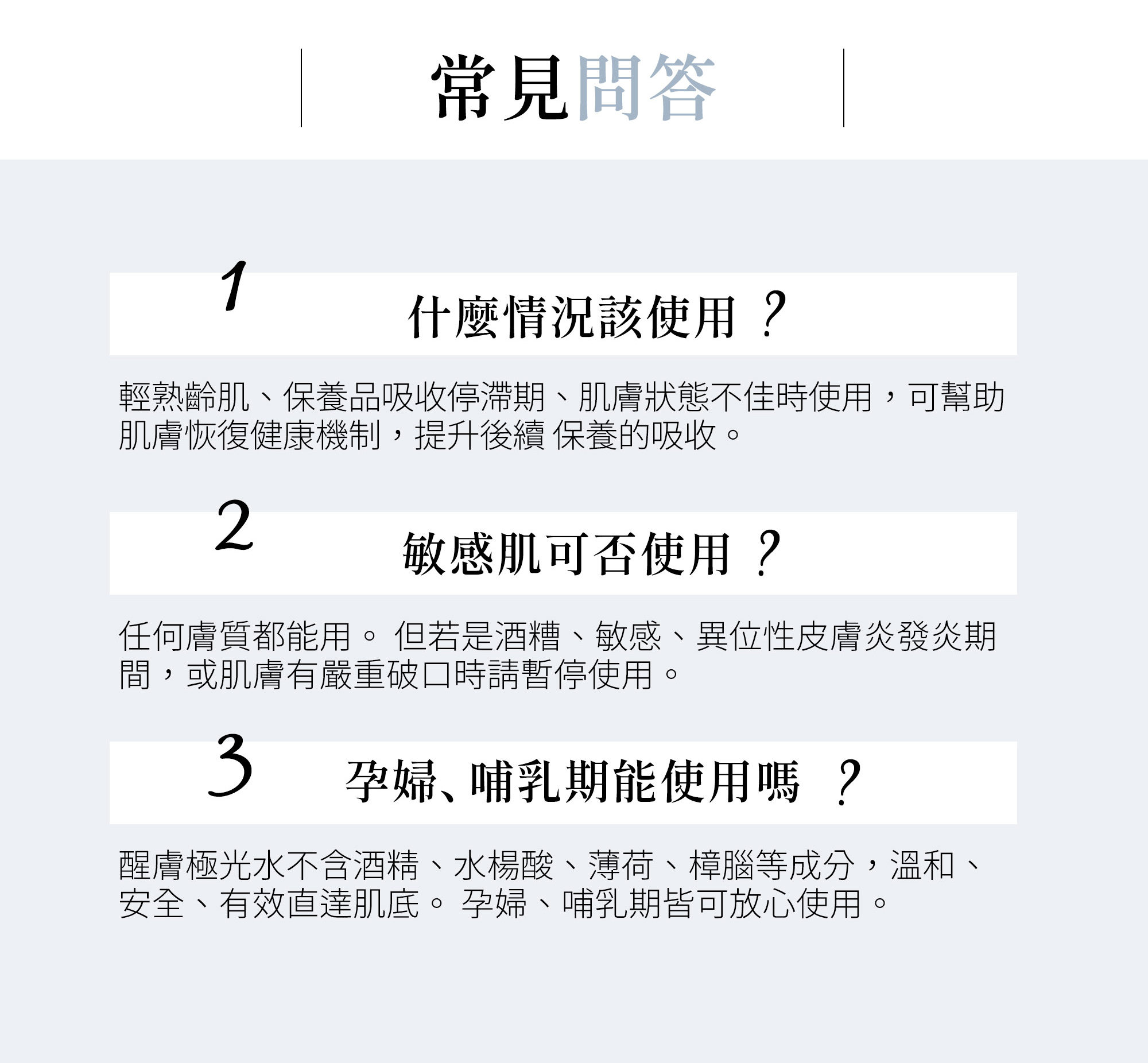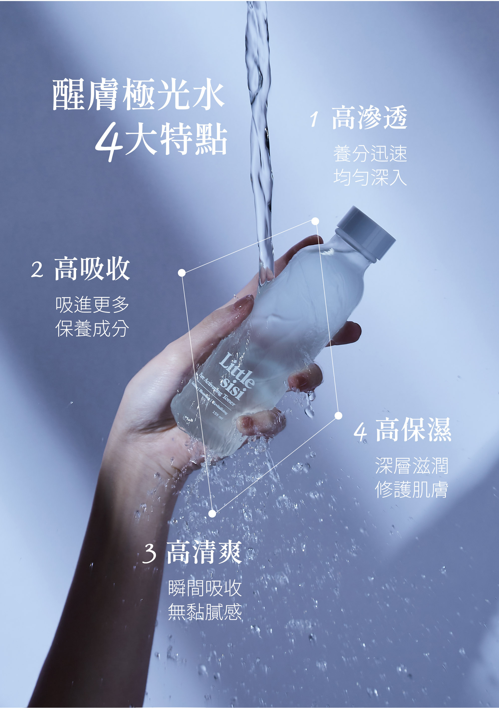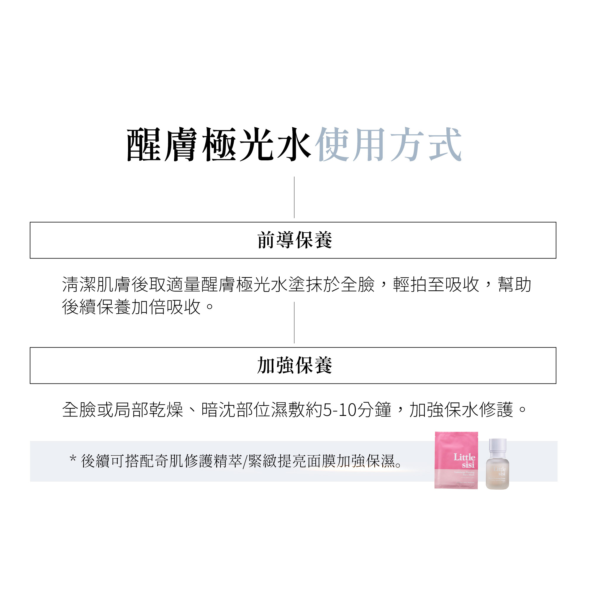 前導保養:清潔肌膚後取適量醒膚極光水塗抹於全臉,輕拍至吸收,幫助後續保養加倍吸收。
